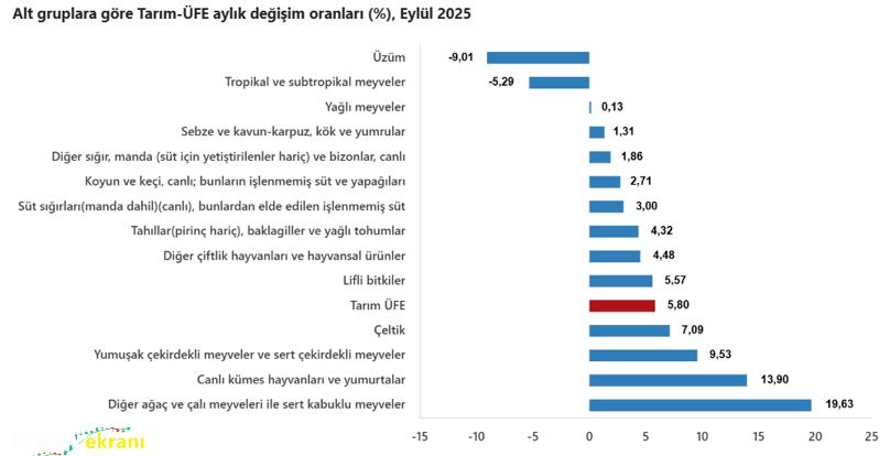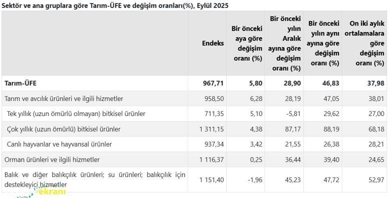 Türkiye İstatistik Kurumu (TÜİK), 2025 yılı Eylül ayına ilişkin tarım ürünleri üretici fiyat endeksi (Tarım-ÜFE) verilerini açıkladı. Tarım-ÜFE’de (2020=100), 2025 yılı Eylül ayında bir önceki aya göre yüzde 5,80 artış, bir önceki yılın Aralık ayına göre yüzde 28,90 artış, bir önceki yılın aynı ayına göre yüzde 46,83 artış ve on iki aylık ortalamalara göre yüzde 37,98 artış gerçekleşti. Böylece tarım ÜFE iki aylık düşüşün ardından yeniden yükselişe geçti.