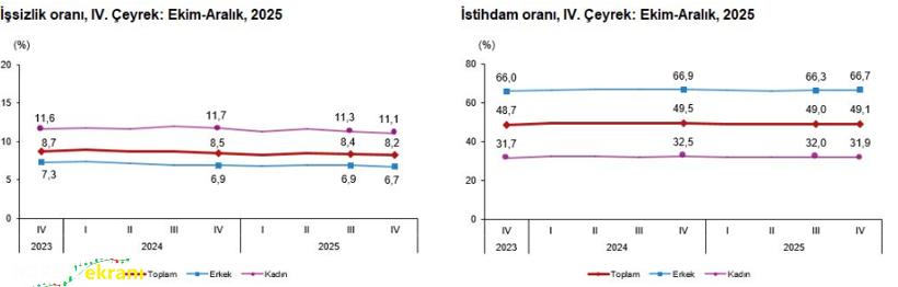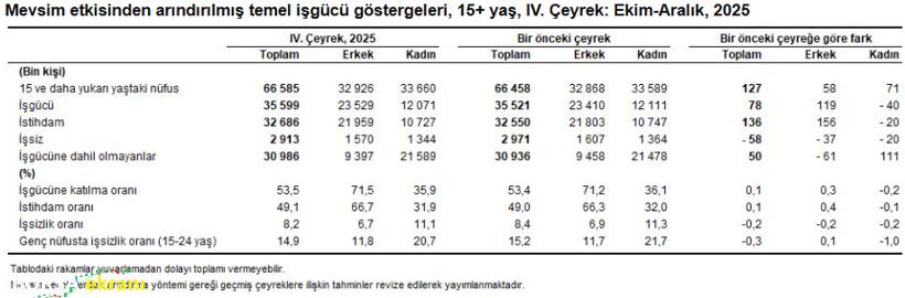 Türkiye İstatistik Kurumu (TÜİK) İşgücü İstatistikleri, IV. Çeyrek: Ekim-Aralık, 2025 verilerini açıkladı. Veriler, işsizlik oranında sınırlı gerilemeye, istihdam ve işgücüne katılımda ise artışa işaret etti. Mevsim etkisinden arındırılmış verilere göre, 15 ve daha yukarı yaştaki işsiz sayısı 2025’in IV. çeyreğinde bir önceki çeyreğe kıyasla 58 bin kişi azalarak 2 milyon 913 bine düştü. İşsizlik oranı 0,2 puan gerileyerek yüzde 8,2 oldu. İşsizlik oranı erkeklerde yüzde 6,7, kadınlarda ise yüzde 11,1 olarak tahmin edildi.