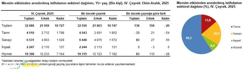 Sektörel dağılıma bakıldığında, mevsim etkisinden arındırılmış istihdam tarımda 33 bin kişi azalırken, sanayide 83 bin, inşaatta 3 bin ve hizmet sektöründe 83 bin kişi arttı. Toplam istihdamın yüzde 13,8’i tarım, yüzde 20,0’ı sanayi, yüzde 6,9’u inşaat ve yüzde 59,3’ü hizmet sektöründe yer aldı.
