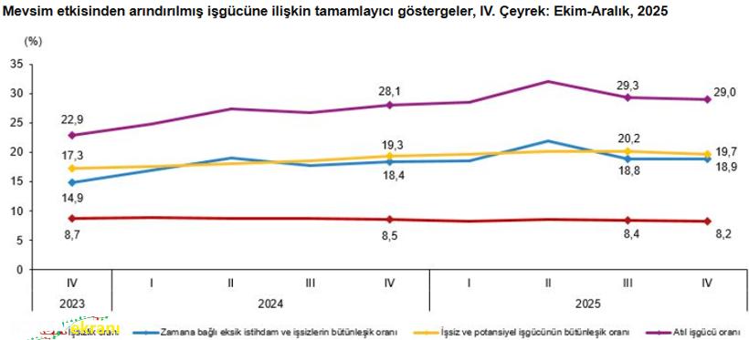 Zamana bağlı eksik istihdam, potansiyel işgücü ve işsizleri kapsayan atıl işgücü oranı IV. çeyrekte 0,3 puan azalarak yüzde 29,0 oldu. Zamana bağlı eksik istihdam ile işsizlerin bütünleşik oranı yüzde 18,9; potansiyel işgücü ile işsizlerin bütünleşik oranı ise yüzde 19,7 olarak hesaplandı.
