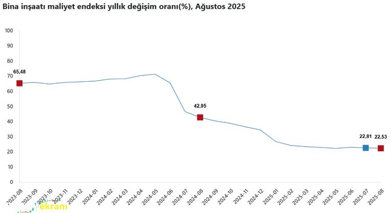 Bina inşaatı maliyet endeksi, bir önceki aya göre yüzde 1,15 arttı, bir önceki yılın aynı ayına göre yüzde 22,53 arttı. Bir önceki aya göre malzeme endeksi yüzde 1,67 arttı, işçilik endeksi yüzde 0,23 arttı.