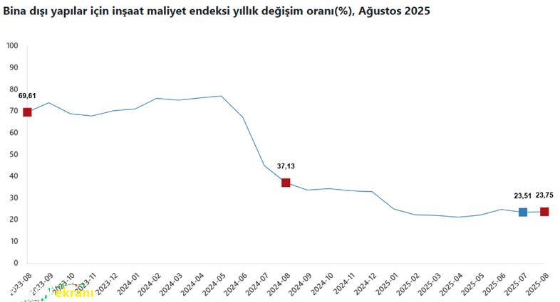 Bina dışı yapılar için inşaat maliyet endeksi, bir önceki aya göre yüzde 0,72 arttı, bir önceki yılın aynı ayına göre yüzde 23,75 arttı.