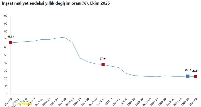Türkiye İstatistik Kurumu (TÜİK), Ekim 2025 dönemine ilişkin inşaat maliyet endeksi verilerini açıkladı. Buna göre endeks, Ekim’de bir önceki aya kıyasla yüzde 0,98 yükselirken, yıllık artış yüzde 22,57 seviyesinde gerçekleşti. Aylık bazda malzeme endeksi yüzde 1,18, işçilik endeksi ise yüzde 0,59 arttı. Yıllık değişimde ise malzeme fiyatları yüzde 18,68, işçilik maliyetleri yüzde 30,49 yükseldi.