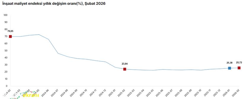 Türkiye İstatistik Kurumu (TÜİK), Şubat 2026 dönemine ilişkin inşaat maliyet endeksi verilerini açıkladı. Açıklanan verilere göre inşaat sektöründe maliyet artışları hem aylık hem de yıllık bazda yükselişini sürdürdü. Buna göre endeks, bir önceki aya kıyasla yüzde 1,51, geçen yılın aynı ayına göre ise yüzde 25,72 yükseldi.
