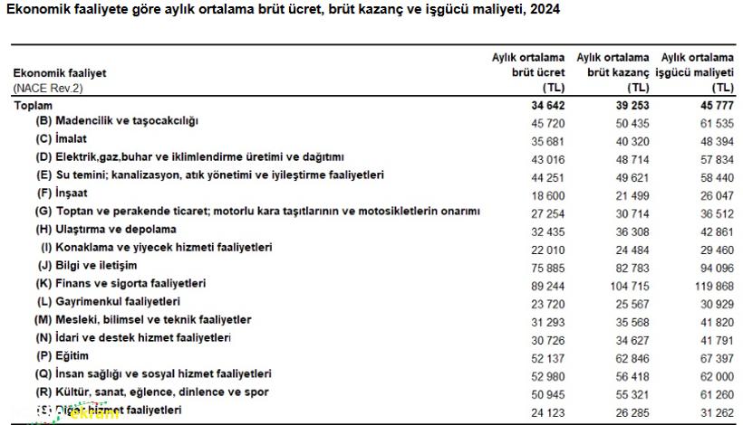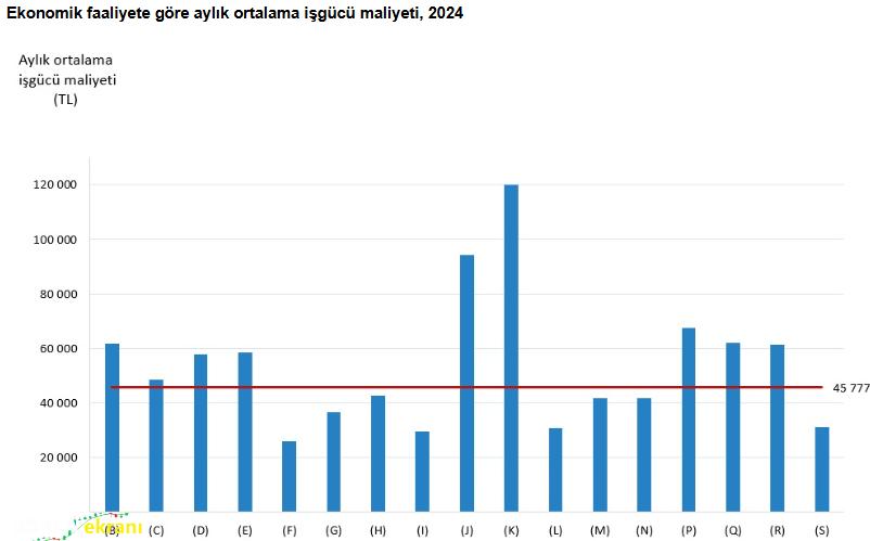 Türkiye İstatistik Kurumu (TÜİK), 2024 yılına ilişkin “İş Gücü Maliyeti İstatistikleri”ni yayımladı. Buna göre, 2024 yılında Türkiye genelinde aylık ortalama işgücü maliyeti 45 bin 777 TL olarak gerçekleşti. İşgücü maliyetinin en yüksek olduğu alan finans ve sigorta faaliyetleri olurken, en düşük maliyet inşaat sektöründe kaydedildi. Finans ve sigorta faaliyetleri sektöründe aylık ortalama işgücü maliyeti 119 bin 868 TL ile ilk sırada yer aldı. Bu sektörü 94 bin 96 TL ile bilgi ve iletişim, 67 bin 397 TL ile eğitim sektörü izledi. İnşaat sektöründe ise aylık ortalama işgücü maliyeti 26 bin 47 TL ile en düşük seviyede gerçekleşti. Konaklama ve yiyecek hizmeti faaliyetlerinde bu tutar 29 bin 460 TL, gayrimenkul faaliyetlerinde ise 30 bin 929 TL oldu.