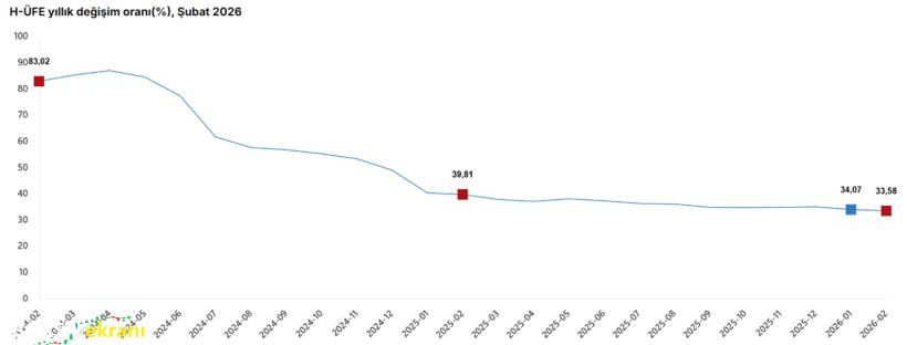 Türkiye İstatistik Kurumu (TÜİK), şubat ayına ilişkin Hizmet Üretici Fiyat Endeksi (H-ÜFE) verilerini yayımladı. Buna göre endeks, şubatta bir önceki aya kıyasla yüzde 2,10 artarken, geçen yılın aralık ayına göre yüzde 10,01 yükseldi. Yıllık bazda artış yüzde 33,58 olurken, on iki aylık ortalamalara göre yükseliş yüzde 35,77 olarak kaydedildi. Alt sektörler incelendiğinde, geçen yılın aynı ayına göre ulaştırma ve depolama hizmetlerinde yüzde 32,04, konaklama ve yiyecek hizmetlerinde yüzde 33,51, bilgi ve iletişim hizmetlerinde yüzde 32,62 artış görüldü. Gayrimenkul hizmetlerinde yüzde 38,64, mesleki, bilimsel ve teknik hizmetlerde yüzde 38,58, idari ve destek hizmetlerde ise yüzde 31,48 artış gerçekleşti.