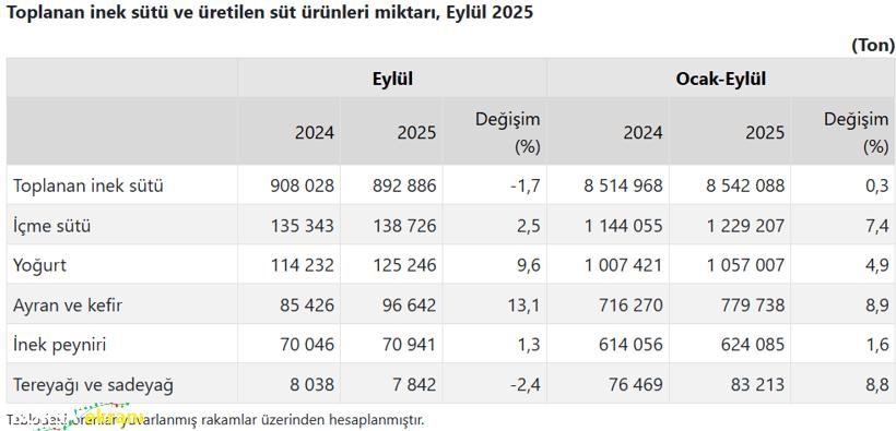 Eylül ayında bir önceki yılın aynı ayına göre; inek peyniri üretimi yüzde 1,3, ayran ve kefir üretimi yüzde 13,1, yoğurt üretimi yüzde 9,6 ve içme sütü üretimi yüzde 2,5 artış kaydetti. Buna karşılık, tereyağı ve sadeyağ üretiminde yüzde 2,4 düşüş yaşandı. Ocak-Eylül dönemine bakıldığında ise inek peyniri üretiminin yüzde 1,6, ayran ve kefirin yüzde 8,9, yoğurdun yüzde 4,9 ve içme sütünün yüzde 7,4 arttığı; tereyağı ve sadeyağ üretiminin ise yüzde 8,8 yükseldiği bildirildi.