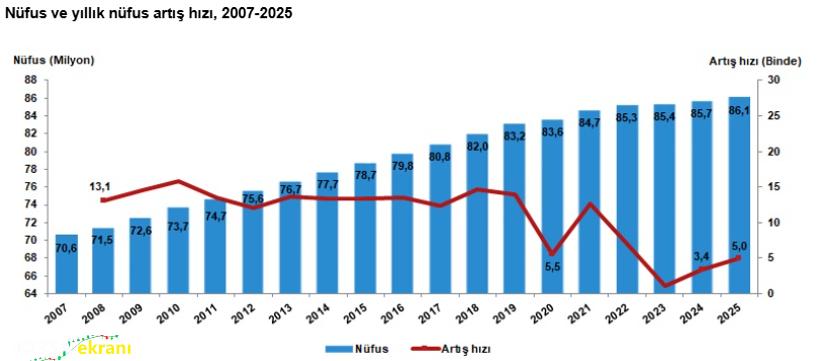 Türkiye İstatistik Kurumu (TÜİK), ‘Adrese Dayalı Nüfus Kayıt Sistemi Sonuçları, 2025‘ verilerini yayımladı. Buna göre Türkiye’de ikamet eden nüfus, 31 Aralık 2024 itibarıyla bir önceki yıla göre 292 bin 567 kişi artarak 85 milyon 664 bin 944’e yükseldi. Erkek nüfus 42 milyon 853 bin 110, kadın nüfus ise 42 milyon 811 bin 834 olarak kaydedildi. Böylece toplam nüfusun yüzde 50,02’sini erkekler, yüzde 49,98’ini kadınlar oluşturdu.