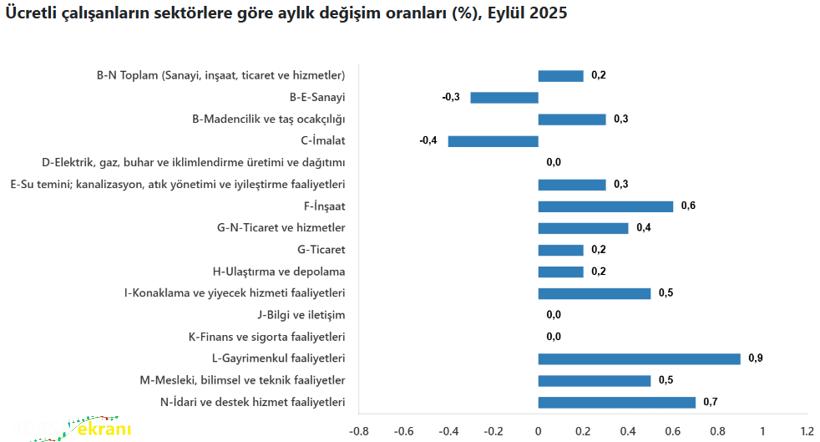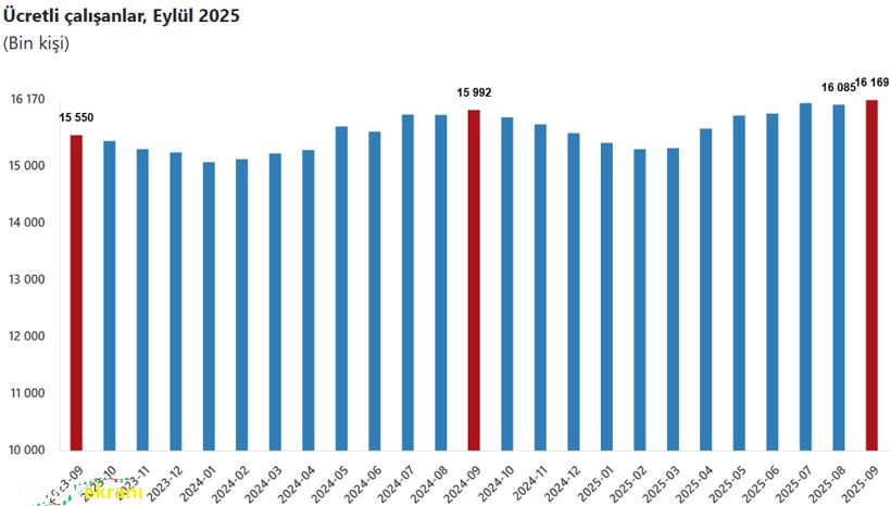 Türkiye İstatistik Kurumu (TÜİK) ‘Ücretli Çalışan İstatistikleri, Eylül 2025‘ verilerini açıkladı. Verilere göre sanayi, inşaat ve ticaret-hizmet sektörlerinin toplamında ücretli çalışan sayısı, geçen yılın aynı dönemine kıyasla yüzde 1,1 artış göstererek 15 milyon 991 bin 589 kişiden 16 milyon 169 bin 476 kişiye yükseldi. Alt sektörler incelendiğinde, yıllık bazda sanayi sektöründe yüzde 3,7’lik düşüş, buna karşılık inşaat sektöründe yüzde 7,4 ve ticaret-hizmet sektöründe yüzde 2,5 artış kaydedildi.