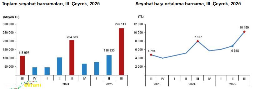 Yerli turistlerin yurt içi seyahat harcamaları ise üçüncü çeyrekte yıllık bazda yüzde 34,8 artışla 276 milyar 111 milyon 406 bin liraya ulaştı. Harcamaların 233 milyar 450 milyon 256 bin liralık kısmını kişisel harcamalar, 42 milyar 661 milyon 150 bin lirasını ise paket tur harcamaları oluşturdu.