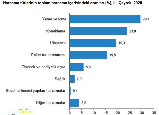 Harcama kalemleri incelendiğinde, toplam seyahat harcamaları içinde en yüksek payı yüzde 29,4 ile yeme ve içme harcamaları aldı. Bunu yüzde 23,8 ile konaklama, yüzde 19,3 ile ulaştırma harcamaları izledi.