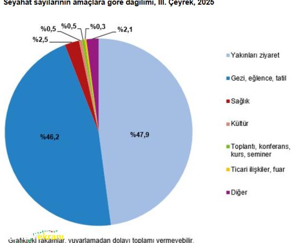 Seyahate çıkış amaçlarında ikinci sırada yüzde 46,2 ile “gezi, eğlence, tatil”, üçüncü sırada ise yüzde 2,5 ile “sağlık” yer aldı.
