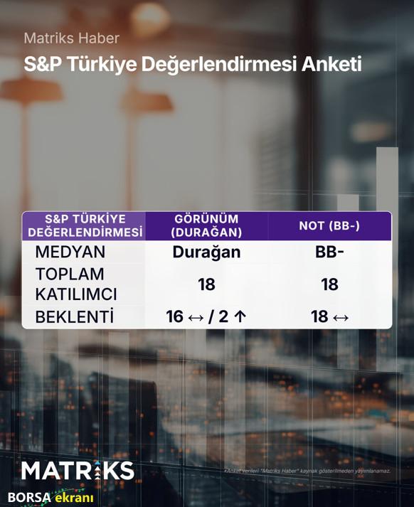 Uluslararası kredi derecelendirme kuruluşu S&P Global’in Nisan ayında yapılması planlanan değerlendirmede Türkiye’nin kredi notunun “BB-“, görünümünün ise “durağan” olarak korunacağı tahmin ediliyor. Matriks Haber’in 18 analistle düzenlediği ankette, kredi notunun sabit bırakılacağı yönünde tam uzlaşı oluştu. Bununla birlikte 16 ekonomist Türkiye’nin görünümünün “durağan” olarak korunacağını tahmin ederken, 2 ekonomist görünümün “pozitif”e yükseltileceği görüşünü dile getirdi. S&P Global, en son 1 Kasım 2024 tarihinde Türkiye’nin “B+” olan kredi notunu “BB-“ye yükseltirken, “pozitif” olan görünümünü “durağan”a çekmişti. S&P Global’in 2026 takvimine göre 17 Nisan 2026 Cuma günü Türkiye ile ilgili bir değerlendirmesi bulunuyor. S&P Global, takvimde yer alan tarihlerde bir rapor yayımlamayabiliyor.
