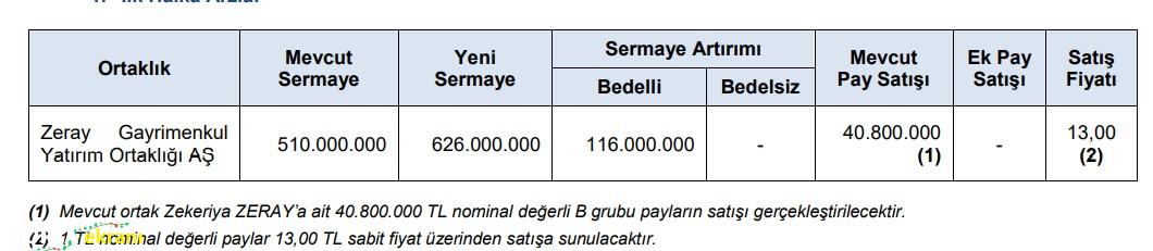 nbsp;Açıklamaya göre mevcut ortak Zekeriya Zeray’a ait 40.800.000 TL nominal değerli B grubu payların satışı gerçekleştirilecek.