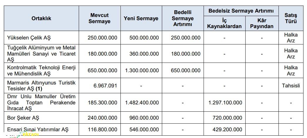SPK 3 şirketin bedelli, 3 şirketin bedelsiz ve 1 şirketin de tahsisli sermaye artırımı başvurusunu onayladı. Yükselen Çelik, Tuğçelik, Kontrolmatik SPK’dan bedelli sermaye artırımı onayı aldı. DMR Unlu Mamüller, Bor Şeker ve Ensari Sınai Yatırımlar bedelsiz sermaye artırımı onayı alan şirketler. SPK, Marmaris Altınyunus’un da tahsisli sermaye artırımı başvurusunu onayladı.nbsp;#Yükselen Çelik (YKSLN) %100 [Bedelli] #Tuğçelik (TUCLK) %100 [Bedelli] #Kontrolmatik (KONTR) %100 [Bedelli] #Marmaris Altın Yunus (MAALT) [Tahsisli] #DMR Unlu Mamüller (DMRGD) %700 [Bedelsiz] #Bor Şeker (BORSK) %300 nbsp; [Bedelsiz] #Ensari Sınai Yatırımlar (ENSRI) 367,46575 nbsp; [Bedelsiz]SPK 6 şirketin borçlanma aracı ihraç başvurusunu onayladı