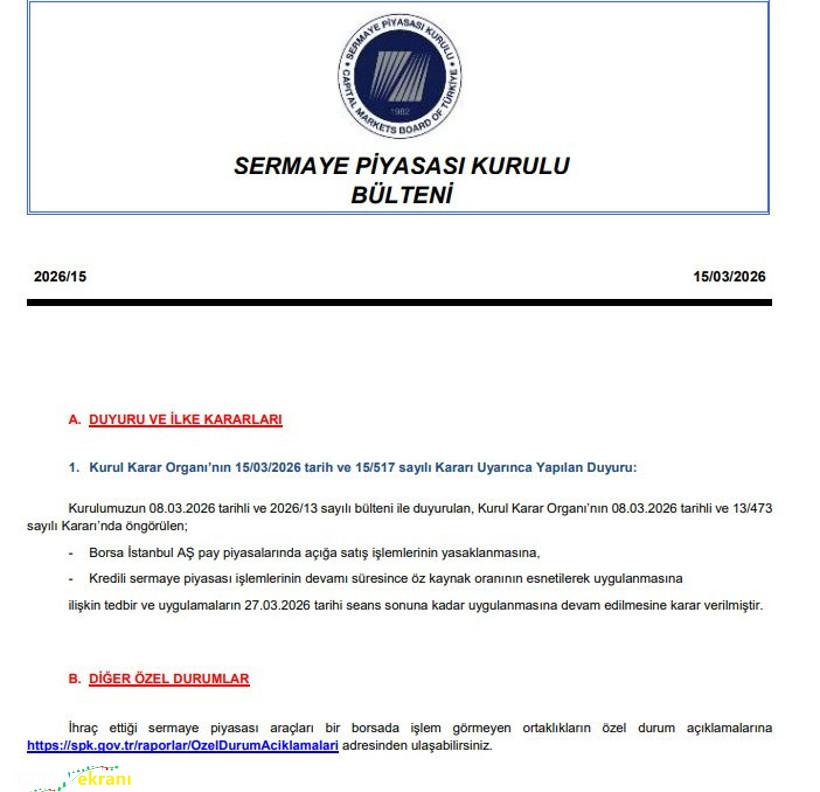 Sermaye Piyasası Kurulu (SPK), 8 Mart 2026 tarihli karar kapsamında getirilen tedbirlerin 27 Mart 2026 tarihli seans sonuna kadar yürürlükte kalacağını açıkladı. Buna göre, Borsa İstanbul pay piyasalarında açığa satış işlemleri yasaklanacak, kredili sermaye piyasası işlemlerinde ise öz kaynak oranı esnetilerek uygulanmaya devam edecek. Ayrıca SPK, ihraç edilen sermaye piyasası araçları herhangi bir borsada işlem görmeyen ortaklıkların özel durum açıklamalarına, Kurul’un resmi internet sitesi üzerinden erişilebileceğini duyurdu.