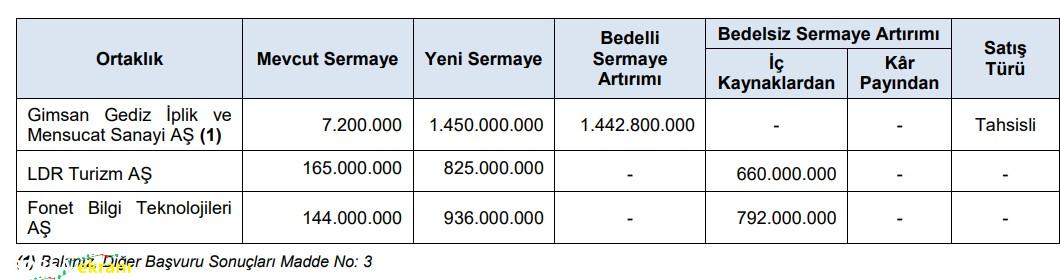 Kurul, Gimsan Gediz İplik ve Mensucat Sanayi AŞ’nin tahsisli, LDR Turizm ve Fonet Bilgi Teknolojileri A.Ş.’nin bedelsiz sermaye artırımı başvurularını onayladı.