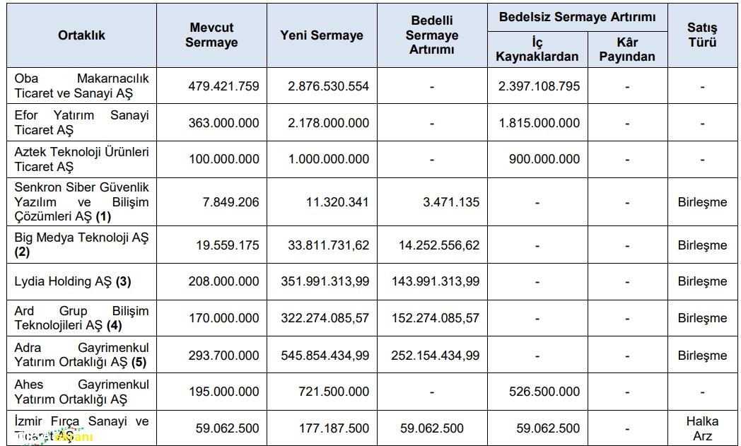 Bültende birleşme açıklamaları şöyle:Senkron Siber Güvenlik Yazılım ve Bilişim Çözümleri AŞ (Şirket) tarafından, Orgino Medya Tanıtım Organizasyon İç ve Dış Ticaret AŞ’nin 30.06.2025 tarihli finansal tablolar esas alınarak tüm aktif ve pasifiyle bir bütün halinde devralınması suretiyle Şirket bünyesinde birleşilmesi için hazırlanan duyuru metnine onay verilmesi talebinin olumlu karşılanmasına karar verilmiştir. b) Şirket esas sözleşmesinin 2, 3 ve 6 ncı maddelerinin değiştirilmesine ilişkin hazırlanan tadil metnine Kurulumuzca uygun görüş verilmesi taleplerinin olumlu karşılanmasına karar verilmiştir. Big Medya Teknoloji AŞ (Şirket) tarafından, Wisest Yazılım AŞ’nin 30.06.2025 tarihli finansal tablolar esas alınarak tüm aktif ve pasifiyle bir bütün halinde devralınması suretiyle Şirket bünyesinde birleşilmesi için hazırlanan duyuru metnine onay verilmesi talebinin, ayrılma hakkının 305,28 TL bedel üzerinden kullandırılması suretiyle olumlu karşılanmasına karar verilmiştir. Lydia Holding AŞ (Şirket) tarafından, Lydia Yatırım Holding AŞ’nin 30.06.2025 tarihli finansal tablolar esas alınarak tüm aktif ve pasifiyle bir bütün halinde devralınması suretiyle Şirket bünyesinde birleşilmesi için hazırlanan duyuru metnine onay verilmesi talebinin, ayrılma hakkının 128,07 TL bedel üzerinden kullandırılması suretiyle olumlu karşılanmasına karar verilmiştir. Ard Grup Bilişim Teknolojileri AŞ (Şirket) tarafından, İntron Bilişim Yazılım Tanıtım ve Tasarım Hizmetleri Sanayi Ticaret AŞ’nin 30.06.2025 tarihli finansal tablolar esas alınarak tüm aktif ve pasifiyle bir bütün halinde devralınması suretiyle Şirket bünyesinde birleşilmesi için hazırlanan duyuru metnine onay verilmesi talebinin, ayrılma hakkının 31,24 TL bedel üzerinden kullandırılması suretiyle olumlu karşılanmasına karar verilmiştir. Adra Gayrimenkul Yatırım Ortaklığı AŞ (Şirket) tarafından, Anadolu Gayrimenkul AŞ’nin 30.06.2025 tarihli finansal tablolar esas alınarak tüm aktif ve pasifiyle bir bütün halinde devralınması suretiyle Şirket bünyesinde birleşilmesi için hazırlanan duyuru metnine onay verilmesi talebinin, ayrılma hakkının 32,38 TL bedel üzerinden kullandırılması suretiyle olumlu karşılanmasına karar verilmiştir. İHRAÇ BAŞVURULARINA ONAYSPK’nin haftalık bültenine göre Kurul, farklı türlerde tahvil, finansman bonosu ve kira sertifikası ihraçları için yapılan başvuruları değerlendirerek onayladı. Borçlanma araçları kapsamında, Enerjisa Enerji AŞ’nin 100 milyar lira, Deniz Faktoring AŞ’nin 11,6 milyar lira, Mercedes Benz Kamyon Finansman AŞ’nin 6,45 milyar lira, Teknosa İç ve Dış Ticaret AŞ’nin 5 milyar lira, Tam Finans Faktoring AŞ’nin 700 milyon lira, Deniz Eko Enerji ve Geri Dönüşüm AŞ’nin 500 milyon lira, Lider Faktoring AŞ’nin 490 milyon lira, Parafinans Faktoring AŞ’nin 450 milyon lira ve Yapı Kredi Yatırım Menkul Değerler AŞ’nin 16,8 milyar lira tahvil/finansman bonosu ihraç başvurularına onay verdi. Buna ek olarak, Türkiye İhracat Kredi Bankası AŞ’nin 8 milyar dolar, Kardemir Çelik Sanayi AŞ’nin 320 milyon dolar, Nurol Holding AŞ’nin 200 milyon dolar ve Fibabanka AŞ’nin 200 milyon dolar tutarındaki yurt dışı tahvil ihraçları Kurul tarafından uygun bulundu. Garanti BBVA Birinci Varlık Finansman Fonu’nun 50 milyar lira Varlığa Dayalı Menkul Kıymet (VDMK), Halk Varlık Kiralama AŞ’nin 40 milyar ve 10 milyar lira kira sertifikası, ZKB Varlık Kiralama AŞ’nin 4 milyar lira, Katılım Varlık Kiralama AŞ’nin 1,5 milyar lira ve KT Sukuk Varlık Kiralama AŞ’nin 1 milyar lira kira sertifikası ihraçları için onay verildi. Vakıf Katılım Portföy Yönetimi AŞ Hisse Senedi Şemsiye Fonu, Vakıf Katılım Portföy Yönetimi AŞ Katılım Şemsiye Fonu ve Ziraat Portföy Yönetimi AŞ Girişim Sermayesi Şemsiye Fonu’nun kuruluşuna izin çıktı. Nurol Portföy Yönetimi AŞ’nin BIST TLREF Endeksi Borsa Yatırım Fonu’nun katılma paylarının halka arzına ilişkin izahname onaylandı.