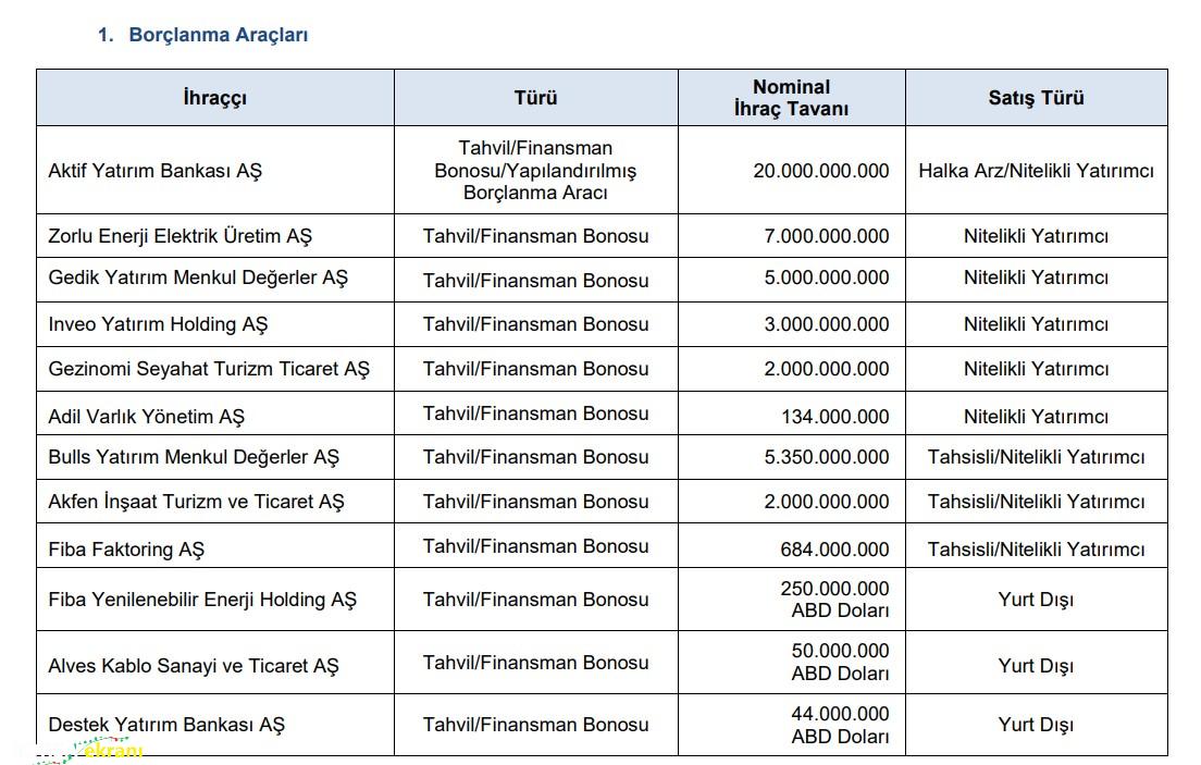 SPK haftalık bültenine göre Kurul, Aktif Yatırım Bankası AŞ’nin 20 milyar liralık, Zorlu Enerji Elektrik Üretim AŞ’nin 7 milyar liralık, Gedik Yatırım Menkul Değerler AŞ’nin 5 milyar liralık, Inveo Yatırım Holding AŞ’nin 3 milyar liralık, Gezinomi Seyahat Turizm Ticaret AŞ’nin 2 milyar liralık, Adil Varlık Yönetim AŞ’nin 134 milyon liralık, Bulls Yatırım Menkul Değerler AŞ’nin 5 milyar 350 milyon liralık, Akfen İnşaat Turizm ve Ticaret AŞ’nin 2 milyar liralık, Fiba Faktoring AŞ’nin 684 milyon liralık, Fiba Yenilenebilir Enerji Holding AŞ’nin 250 milyon dolarlık, Alves Kablo Sanayi ve Ticaret AŞ’nin 50 milyon dolarlık ve Destek Yatırım Bankası AŞ’nin 44 milyon dolarlık borçlanma aracı ihraç başvurularına izin verdi. Kurul, Ata Varlık Kiralama AŞ’nin 6 milyar liralık, KT Sukuk Varlık Kiralama AŞ’nin 8 milyar liralık, Hedef Varlık Kiralama AŞ’nin 500 milyon liralık yönetim sözleşmesine dayalı kira sertifikası ihracı başvurusuna, TMKŞ Fibabanka Beşinci Varlık Finansmanı Fonu’nun 30 milyar liralık ve TMKŞ Tera Bank İkinci Varlık Finansmanı Fonu’nun 10 milyar liralık varlığa dayalı menkul kıymet ihracı onay verdi. BNP Paribas Cardif Emeklilik AŞ’nin BNP Paribas Cardif Emeklilik AŞ BIST 30 Dışı Şirketler Hisse Senedi Emeklilik Yatırım Fonu’nun kuruluşuna izin veren Kurul, One Portföy Yönetimi AŞ Birinci Proje Gayrimenkul Yatırım Fonu’nun kuruluşuna izin verdi ve katılma paylarının ihracına ilişkin ihraç belgesini onayladı.