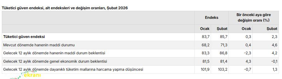 Tüketici güven endeksi, Ocak ayında 83,7 iken Şubat ayında yüzde 2,3 oranında artarak 85,7 oldu. Mevcut dönemde hanenin maddi durum endeksi 68,2’den 71,3’e yükselirken, aylık artış yüzde 4,6 oldu. Gelecek 12 aya ilişkin maddi durum beklentisi de iyileşme gösterdi. Ocakta 83,3 olan endeks şubatta 86,8’e çıktı.