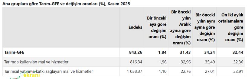 TÜİK, Tarımsal Girdi Fiyat Endeksi’nin (Tarım-GFE) Kasım 2025 sonuçlarını açıkladı. Buna göre Tarım-GFE, kasım ayında yıllık yüzde 34,24, aylık yüzde 1,84 artış gösterdi. Endeks, bir önceki yılın Aralık ayına göre yüzde 31,43, on iki aylık ortalamalara göre ise yüzde 32,44 yükseldi. Ana gruplar incelendiğinde, tarımda kullanılan mal ve hizmetler endeksi aylık bazda yüzde 1,96, tarımsal yatırıma katkı sağlayan mal ve hizmetler endeksi ise yüzde 1,10 arttı. Yıllık bazda tarımda kullanılan mal ve hizmetlerdeki artış yüzde 35,49, tarımsal yatırıma katkı sağlayan kalemlerdeki artış ise yüzde 27,01 olarak kaydedildi.