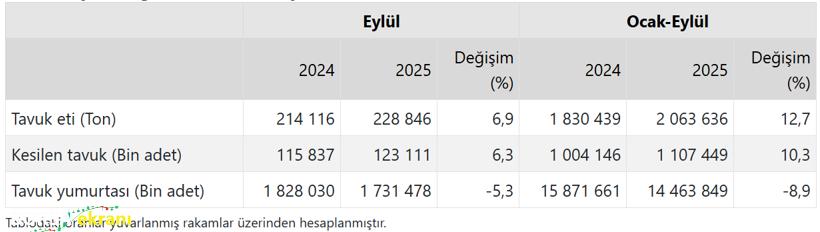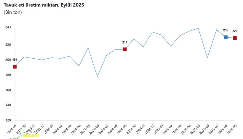 Aylık değişimlere bakıldığında, Ağustos ayında 229 bin 965 ton olan tavuk eti üretimi Eylül’de yüzde 0,5 düşüşle 228 bin 846 tona geriledi.