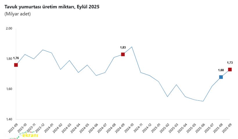 Tavuk yumurtası üretimi ise bir önceki ay 1 milyar 679 milyon 706 bin adet seviyesindeyken, Eylül ayında yüzde 3,1 artarak 1 milyar 731 milyon 478 adede çıktı.