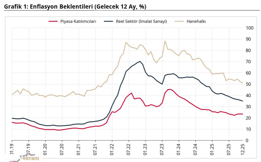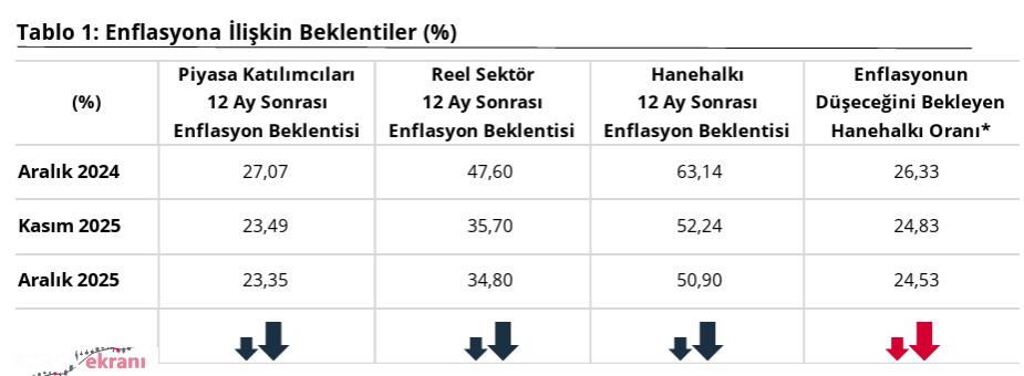 Türkiye Cumhuriyet Merkez Bankası (TCMB) aralık ayına ait “Sektörel Enflasyon Beklentisi” anketi sonuçlarını açıkladı. Buna göre, söz konusu dönemde 12 ay sonrası yıllık enflasyon beklentileri bir önceki aya göre, piyasa katılımcıları için 0,14 puan azalarak yüzde 23,35 seviyesine, reel sektör için 0,90 puan azalarak yüzde 34,80 seviyesine, hanehalkı için 1,34 puan azalarak yüzde 50,90 seviyesine geriledi. Piyasa Katılımcıları Anketi, İktisadi Yönelim Anketi ve Türkiye İstatistik Kurumu iş birliğiyle yürütülen Tüketici Eğilim Anketi ile finansal ve reel sektör uzmanlarının, imalat sanayi firmalarının ve hanehalkının 12 ay sonrası yıllık tüketici enflasyonu beklentileri derlenerek Sektörel Enflasyon Beklentileri elde ediliyor.