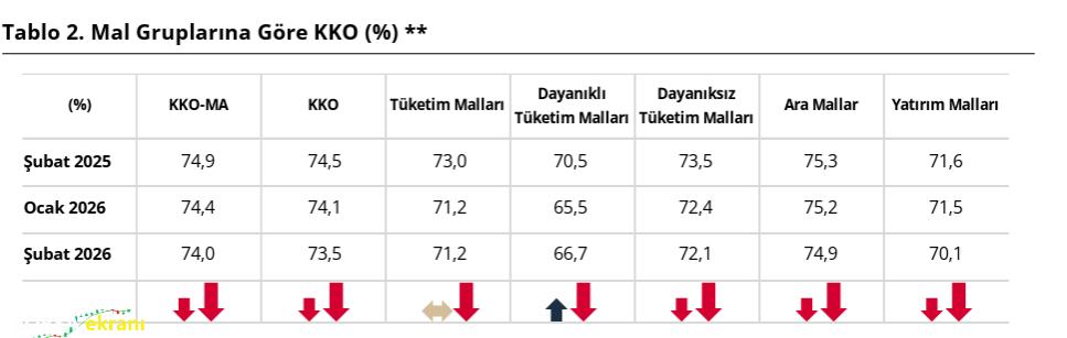 Mevsimsel etkilerden arındırılmamış Kapasite Kullanım Oranı (KKO) ise, bir önceki aya göre 0,6 puan azalarak yüzde 73,5 oldu.