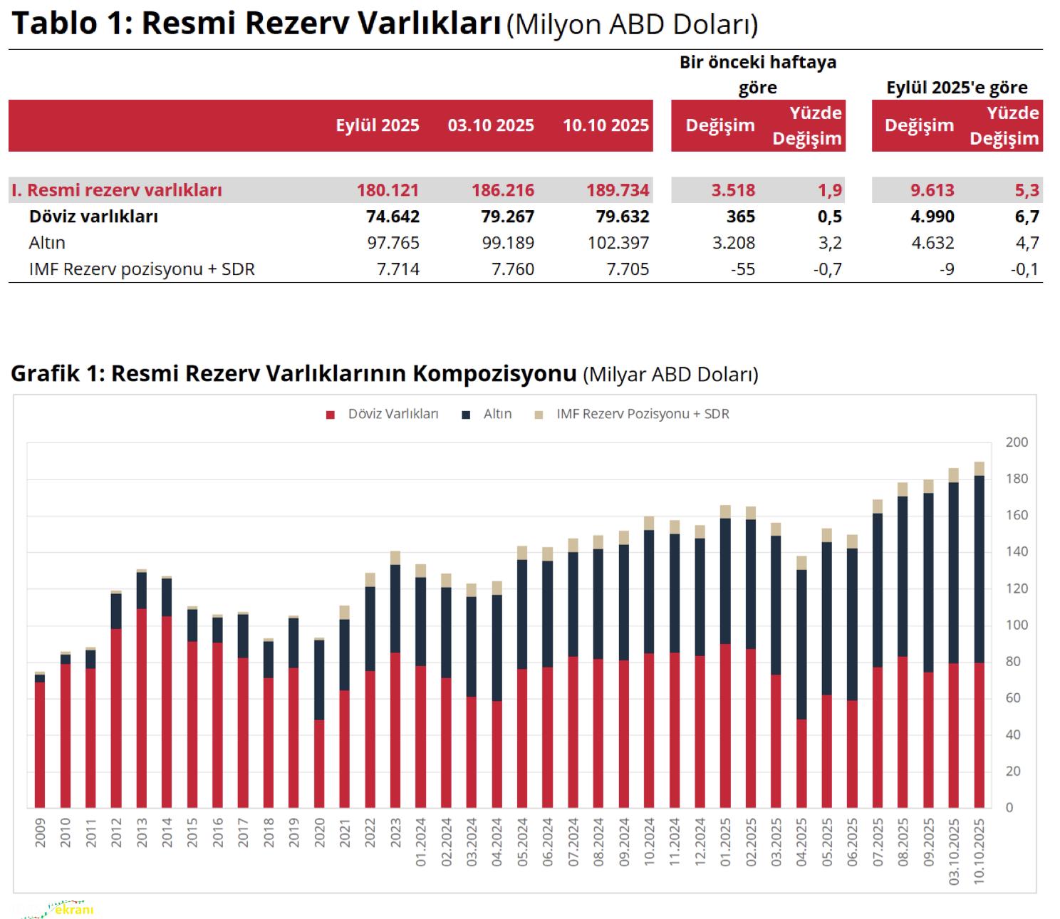 Investing.com – Türkiye Cumhuriyet Merkez Bankası (TCMB), 10 Ekim haftasına ait “Uluslararası Rezervler ve Döviz Likiditesi Gelişmeleri” raporunu yayımladı. Rapora göre, Türkiye’nin resmi rezerv varlıkları bir önceki haftaya kıyasla %1,9 oranında artış göstererek 189,7 milyar ABD doları seviyesine yükseldi. Söz konusu artışta hem döviz varlıkları hem de altın rezervlerindeki yükseliş etkili oldu. Haftalık bazda döviz varlıkları %0,5 artışla 79,6 milyar dolara ulaşırken, altın cinsinden rezerv varlıkları ise %3,2 artarak 102,4 milyar dolar olarak kayıtlara geçti. IMF rezerv pozisyonu ve SDR toplamı ise %0,7 azalarak 7,7 milyar dolar seviyesine geriledi.