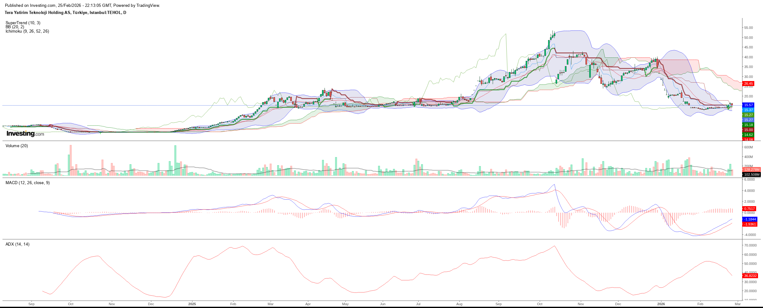 Trend perspektifinden bakıldığında, TEHOL hissesinin 43 TL seviyelerinden başlayan ana düşüş trendi henüz sonlanmış değil. Fiyatın hem ana trend çizgisinin hem de Ichimoku bulutunun altında kalmaya devam etmesi (yaklaşık 15,18–26,46 TL bandı), orta vadeli görünümde aşağı yönlü risklerin sürdüğüne işaret ediyor.