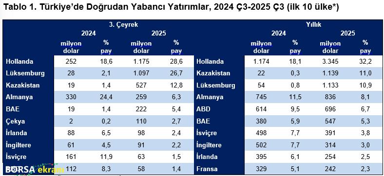 Bültende paylaşılan bilgilere göre 2025 yılı üçüncü çeyreğinde Türkiye’ye yapılan doğrudan yabancı yatırımların yüzde 28,6’sı Hollanda tarafından yapıldı. Üçüncü çeyrekte doğrudan yabancı yatırımların ülke dağılımlarına bakıldığında, yüzde 28,6’lık payı ile ilk sıradaki Hollanda’nın ardından yüzde 26,7’lik yatırım payı ile Lüksemburg geldi.