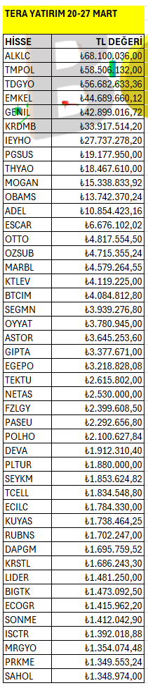 Tera Yatırım’ın haftalık bazda Borsa İstanbul’da en fazla yatırım yaptığı hisselerin listesi. Listeyi PDF formatında indirip inceleyebilirsiniz.