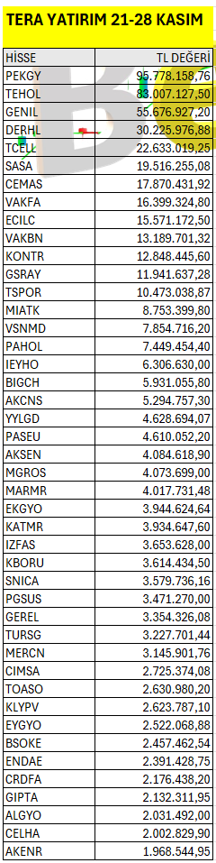 Tera Yatırım’ın haftalık bazda Borsa İstanbul’da en fazla yatırım yaptığı hisselerin listesi. Listeyi PDF formatında indirip inceleyebilirsiniz.