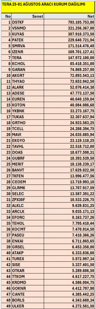 Tera Yatırım’ın Aracı Kurum Dağılımına göre (AKD) haftalık bazda Borsa İstanbul’da en fazla yatırım yaptığı hisselerin listesi. Listeyi PDF formatında indirip inceleyebilirsiniz.