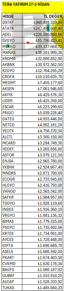 Tera Yatırım’ın haftalık bazda Borsa İstanbul’da en fazla yatırım yaptığı hisselerin listesi. Listeyi PDF formatında indirip inceleyebilirsiniz.