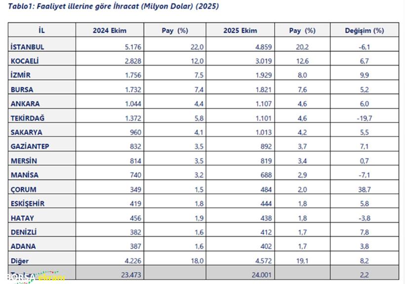2025 yılı Ekim ayında faaliyet illerine göre ihracat sıralaması şu şekilde gerçekleşti:
