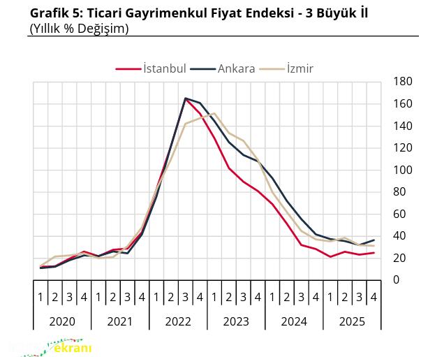 Üç büyük ildeki gelişmeler değerlendirildiğinde, İstanbul, Ankara ve İzmir’in ticari gayrimenkul fiyat endeksleri, 2025 yılı dördüncü çeyreğinde bir önceki çeyreğe göre, sırasıyla yüzde 7,8, 8,1 ve 7,1 oranlarında artış gösterdi.nbsp;Endeks değerleri bir önceki yılın aynı çeyreğine göre ise, İstanbul, Ankara ve İzmir’de sırasıyla yüzde 25, 36,5 ve 31,3 oranlarında artış kaydetti.