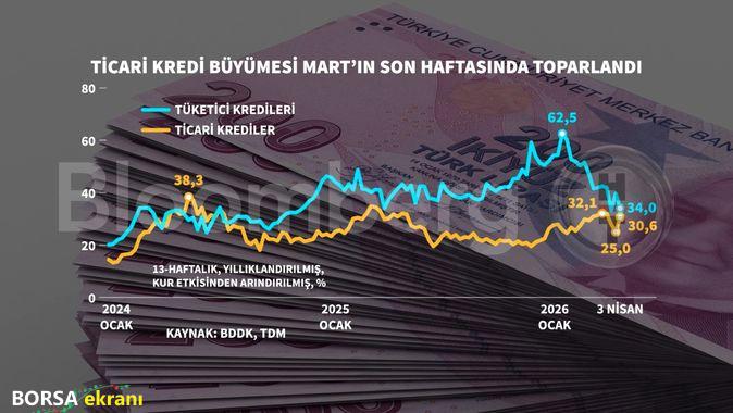 Bankacılık Düzenleme ve Denetleme Kurulu (BDDK) ve Turkey Data Monitor verileri ticari kredi büyümesinde Mart ayının son haftası itibarıyla dikkat çekici bir toparlanmaya işaret etti. Kur etkisinden arındırılmış 13 haftalık yıllıklandırılmış verilere göre, ticari kredilerde büyüme oranı yeniden yükseliş eğilimine girdi. Verilere göre, Mart ayı içinde yüzde 25,0 seviyelerine kadar gerileyen ticari kredi büyümesi, 3 Nisan haftası itibarıyla hızlı bir toparlanma göstererek yüzde 30,6 seviyesine ulaştı. Bu oran, daha önce kaydedilen yüzde 32,1’lik yerel zirveye yaklaşılması açısından dikkat çekti. Ticari kredilerdeki bu ivmelenmeye karşın, tüketici kredilerinde zayıflama eğilimi devam etti. 2026 yılı başında yüzde 62,5 seviyesine kadar çıkan tüketici kredisi büyümesi, 3 Nisan haftasında yüzde 34,0’e geriledi. Böylece ticari ve bireysel krediler arasındaki büyüme farkı önemli ölçüde daraldı. Veriler, bankacılık sektöründe kredi iştahının ticari segmentte yeniden canlandığını, buna karşılık bireysel kredilerde sıkılaşma eğiliminin sürdüğünü ortaya koydu.