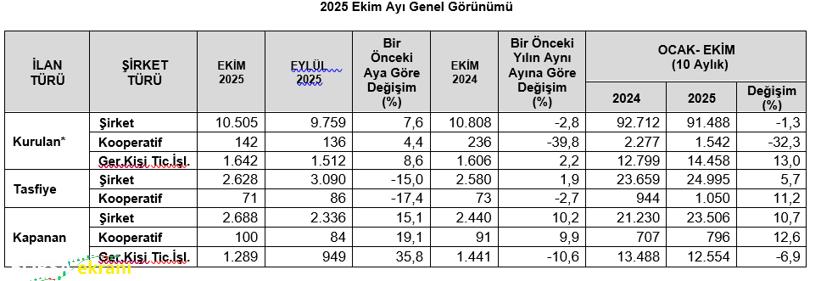 10 aylık verilere bakıldığında ise 2025 Ocak-Ekim döneminde kurulan şirket sayısı geçen yılın aynı dönemine göre yüzde 1,3 düşüşle 91 bin 488’e geriledi. Geçen yıl aynı dönemde kurulan şirket sayısı 92 bin 712 idi. Ocak-ekim döneminde kapanan şirket sayısına bakıldığında ise geçen yıla göre yüzde 10,7 artış yaşandı. 2024’ün ik 10 ayında 21 bin 230 şirket kapanırken bu sayı 2025’te 23 bin 506’ya yükseldi.