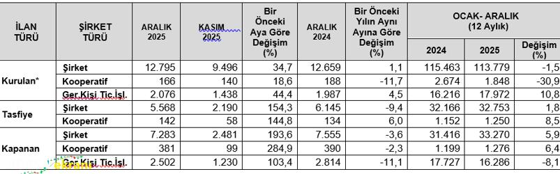 Aralıkta bir önceki aya göre kurulan gerçek kişi ticari işletme sayısı yüzde 44,4 artarken kapanan gerçek kişi ticari işletme sayısı ise yüzde 103,4 oranında arttı. Kurulan kooperatif sayısı ise önceki aya oranla yüzde 18,6 oranında artarken kapanan kooperatif sayısı yüzde 284,9 yükseldi. 12 aylık verilerde ise kapanan gerçek kişi ticari işletme sayısı geçen yılki 17 bin 727 seviyesinden 16 bin 286’ya geriledi. 12 aylık kooperatif kapanışlarına bakıldığında ise geçen yıla göre yüzde 6,4 yükseliş görüldü. 2025’te 1276 kooperatif kapanırken geçen yıl bu sayı 1199 seviyesindeydi.