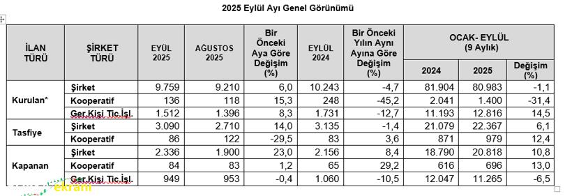 9 aylık verilere bakıldığında ise 2025 ocak-eylül döneminde kurulan şirket sayısı geçen yılın aynı dönemine göre yüzde 1,1 düşüşle 80 bin 983’e geriledi. Geçen yıl aynı dönemde kurulan şirket sayısı 81 bin 904 idi. 2025’in ilk 9 ayında, 2024’ün ilk 9 ayına göre kurulan kooperatif sayısı yüzde 31,4 oranında azalırken kurulan gerçek kişi ticari işletme sayısı yüzde 14,5 oranında arttı. Ocak-eylül döneminde kapanan şirket sayısına bakıldığında ise geçen yıla göre yüzde 10,8 artış yaşandı. 2024’ün ik 9 ayında 18 bin 790 şirket kapanırken bu sayı 2025’te 20 bin 818’e yükseldi. 2025’in ilk 9 ayında, 2024’ün ilk 9 ayına göre kapanan kooperatif sayısı yüzde 13 oranında artarken kapanan gerçek kişi ticari işletme sayısında yüzde 6,5 azalış oldu.