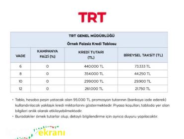 TRT, çalışanlarının maaş promosyonu için Halkbank ile anlaştı. Promosyon tutarı 95 bin TL olarak açıklandı. TRT tarafından personele yapılan duyuru şöyle: “Yeni dönemi kapsayan maaş ve promosyon protokolü, Halkbank (Türkiye Halk Bankası A.Ş.) ile imzalanmıştır. Yapılan protokol kapsamında, promosyon tutarı 95.000 TL nakit ve 15.000 TL ParafPara olmak üzere toplam 110.000 TL olarak belirlenmiş olup; nakit promosyon tutarı Aralık 2025 maaşının ardından tek seferde, ParafPara tutarı ise Ocak, Şubat ve Mart 2026’da üç eşit parça halinde hesaplara yatırılacaktır. Protokol süresince: Banka şubesi, ATM, internet/mobil/telefon bankacılığı aracılığıyla havale, FAST ve mesai saatleri içerisinde yapılacak EFT işlemlerinden, maaş hesaplarına tanımlanacak elektrik, doğalgaz, telekomünikasyon, su vb. otomatik fatura ödeme talimatlarından, banka kartı, kredi kartı, çalışanın eşi ve çocukları için talep edilecek ek kartlardan ücret alınmayacaktır. Banka promosyonunu tercih etmeyen çalışma arkadaşlarımıza, 6, 8, 10, 12 ay seçenekli sıfır faizli kredi imkânı sunulmuştur. (Örnek kredi tutarı ve ödemeler için ekteki dosyaya bakabilirsiniz.) Kurumumuzun yoğun çalışmaları sonucu yapılan anlaşmanın tüm çalışma arkadaşlarımıza hayırlı olmasını dileriz.”