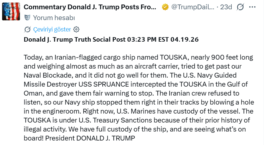 Donald Trump, sosyal medya hesabından yaptığı açıklamada, ABD donanmasının İran’a ait olduğu belirtilen bir kargo gemisine müdahalede bulunduğunu duyurdu. Trump, İran bayraklı Touska adlı geminin ABD’nin uyguladığı deniz ablukasını aşmaya çalıştığını iddia etti.