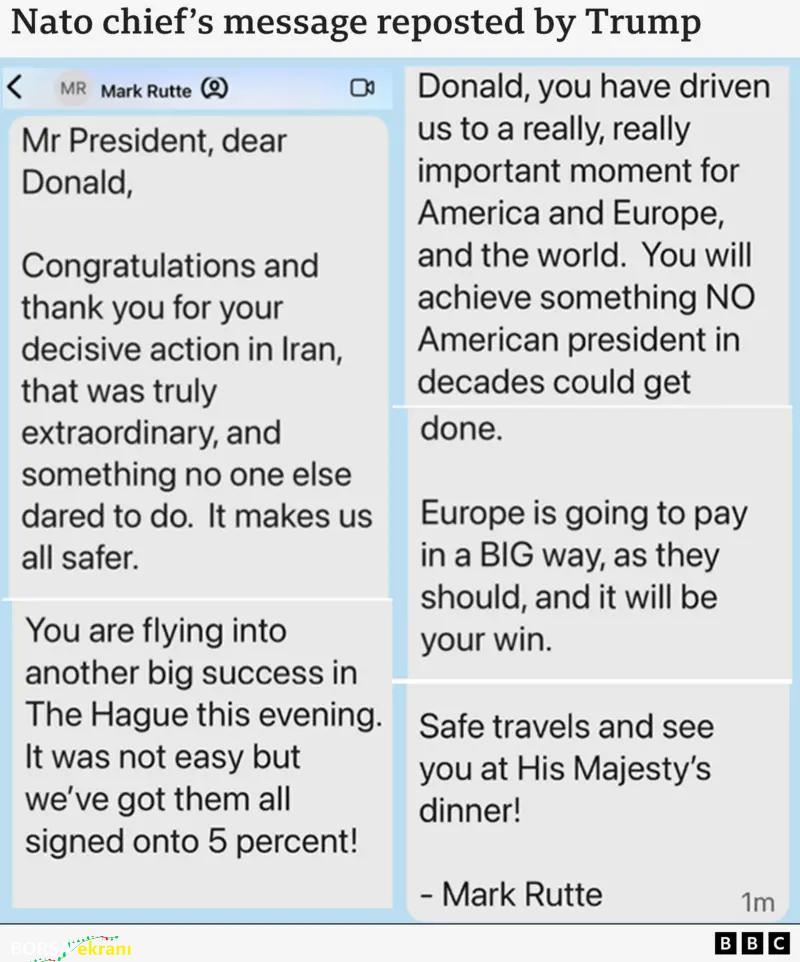 Trump, NATO Zirvesi’ne katılmak için Lahey’e giderken, Truth Social sosyal medya hesabından, NATO Genel Sekreteri Mark Rutte’nin kendisine attığı mesajların ekran görüntüsünü paylaştı.nbsp;