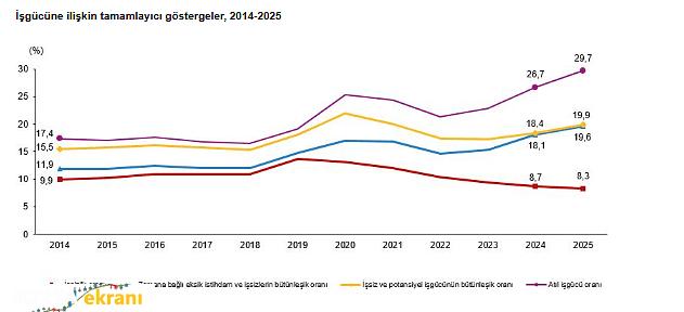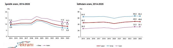 İstihdam oranı yüzde 49 olarak açıklandı İstihdam edilenlerin sayısı 2025 yılında bir önceki yıla göre 54 bin kişi azalarak 32 milyon 566 bin kişi, istihdam oranı ise 0,5 puan azalarak yüzde 49 oldu.nbsp;Bu oran erkeklerde yüzde 66,4 iken, kadınlarda yüzde 32,1 olarak gerçekleşti. İşgücüne katılma oranı yüzde 53,5 oldu İşgücü 2025 yılında bir önceki yıla göre 200 bin kişi azalarak 35 milyon 533 bin kişi, işgücüne katılma oranı ise 0,7 puan azalarak yüzde 53,5 olarak gerçekleşti.nbsp;İşgücüne katılma oranı erkeklerde yüzde 71,3, kadınlarda ise yüzde 36,2 oldu. Genç nüfusta işsizlik oranı yüzde 15,3 oldu 15-24 yaş grubunu kapsayan genç nüfusta işsizlik oranı 2025 yılında bir önceki yıla göre 1 puan azalarak yüzde 15,3 oldu.