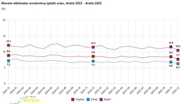 Türkiye İstatistik Kurumu İşgücü İstatistikleri, Aralık 2025 bültenini yayımladı. Hanehalkı İşgücü Araştırması sonuçlarına göre; 15 ve daha yukarı yaştaki kişilerde işsiz sayısı 2025 yılı Aralık ayında bir önceki aya göre 286 bin kişi azalarak 2 milyon 736 bin kişi oldu. İşsizlik oranı ise 0,8 puan azalarak yüzde 7,7 seviyesinde gerçekleşti. İşsizlik oranı erkeklerde yüzde 6,3 iken kadınlarda yüzde 10,5 olarak tahmin edildi.