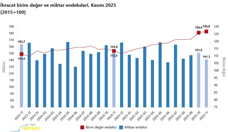 Türkiye İstatistik Kurumu (TÜİK) Kasım 2025 dönemine ilişkin Dış Ticaret Endeksleri bültenini yayımladı. Buna göre, ihracat birim değer endeksi kasım ayında bir önceki yılın aynı ayına göre yüzde 11,7 arttı. Endeks bir önceki yılın aynı ayına göre gıda, içecek ve tütünde yüzde 9,5 arttı, ham maddelerde (yakıt hariç) yüzde 9,5 arttı, yakıtlarda yüzde 4,2 azaldı, imalat sanayinde (gıda, içecek, tütün hariç) yüzde 13,2 arttı. İhracat miktar endeksi ise kasım ayında bir önceki yılın aynı ayına göre yüzde 9,3 azaldı. Endeks bir önceki yılın aynı ayına göre gıda, içecek ve tütünde yüzde 8,1 azaldı, ham maddelerde (yakıt hariç) yüzde 9,3 azaldı, yakıtlarda yüzde 6,6 azaldı, imalat sanayinde (gıda, içecek, tütün hariç) yüzde 8,4 azaldı.