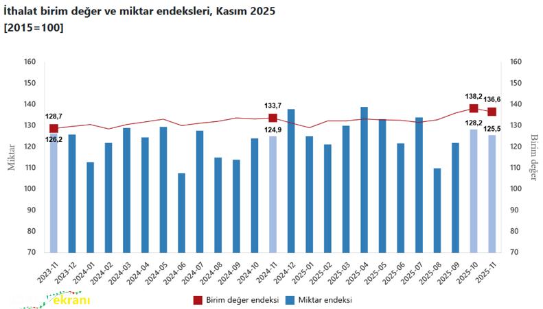 İthalat birim değer endeksi kasım ayında bir önceki yılın aynı ayına göre yüzde 2,2 arttı. Endeks bir önceki yılın aynı ayına göre, gıda, içecek ve tütünde yüzde 9,3 arttı, yakıtlarda yüzde 8,3 azaldı, ham maddelerde (yakıt hariç) yüzde 2,6 azaldı, imalat sanayinde (gıda, içecek, tütün hariç) yüzde 1,4 arttı.