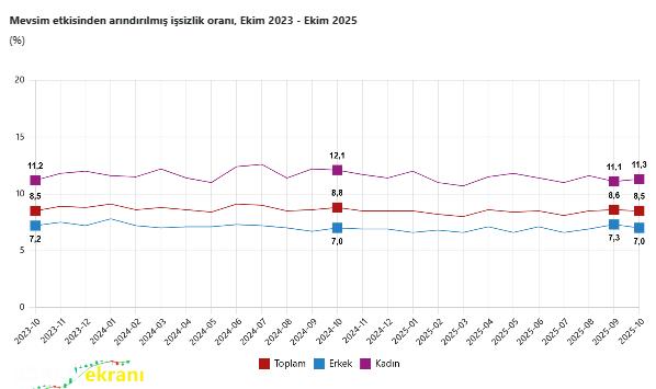 Türkiye İstatistik Kurumu (TÜİK) ekim ayı iş gücü istatistiklerini açıkladı. Buna göre, Hanehalkı İşgücü Araştırması sonuçlarına göre; 15 ve daha yukarı yaştaki kişilerde işsiz sayısı 2025 yılı Ekim ayında bir önceki aya göre 27 bin kişi azalarak 3 milyon 33 bin kişi oldu. İşsizlik oranı ise 0,1 puan azalarak yüzde 8,5 seviyesinde gerçekleşti.nbsp;İşsizlik oranı erkeklerde yüzde 7 iken, kadınlarda yüzde 11,3 olarak tahmin edildi.